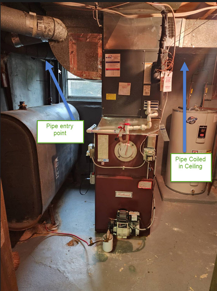 Rick, there is just one line coming out of the tank. The coiled pipe in the ceiling is above the water heater. You won’t see too many oil water heaters. Lines go to the porch and kitchen. Likely associated with a heater in the porch and the stove in the kitchen. What appliances use oil? Only the furnace?