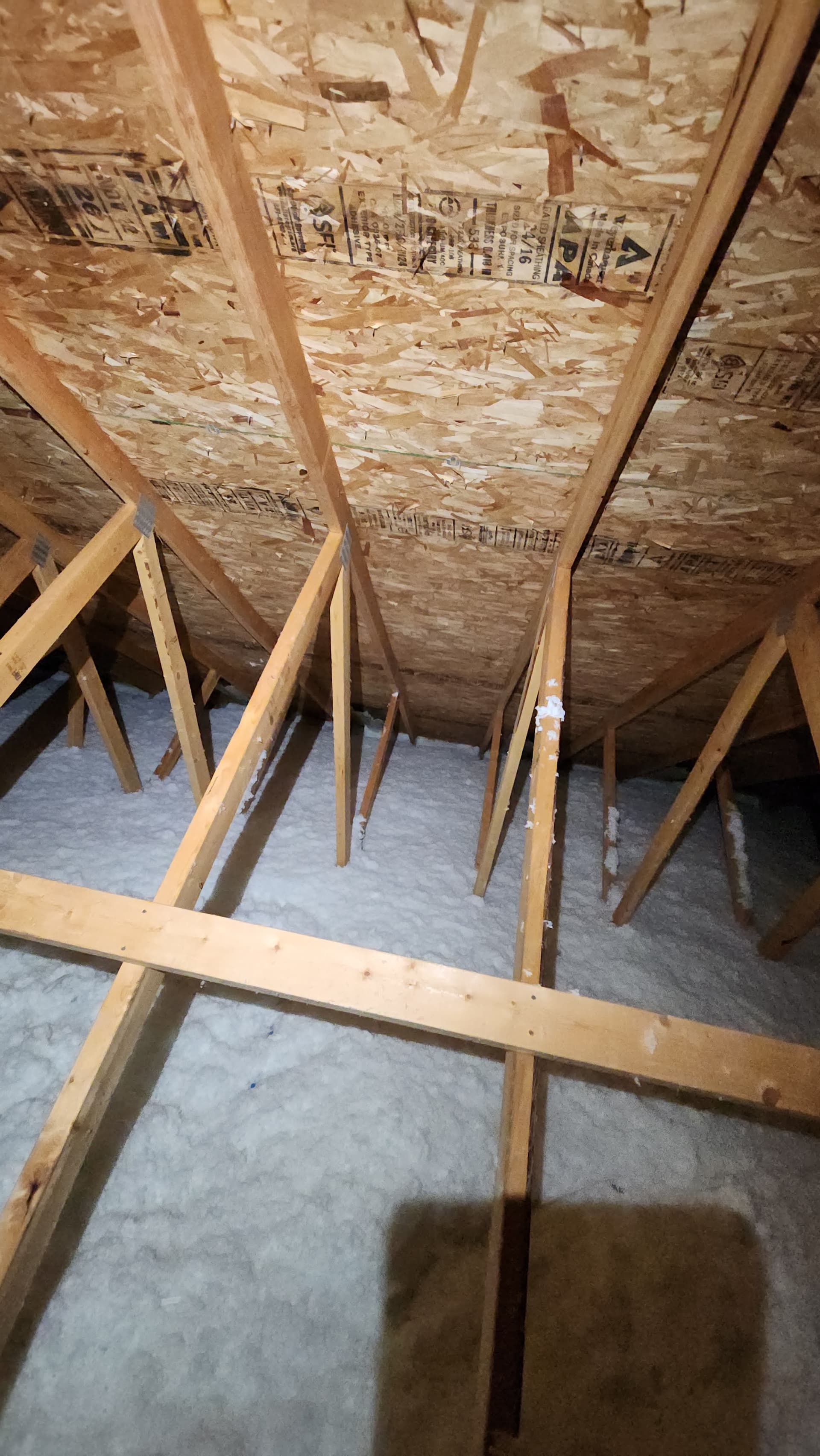 West coast of Canada in moderate climate that doesn’t freeze often. 2013 build. 3 bed, 2 bath rancher with architectural shingle roof. Roof appeared to be in good condition. Roof sheathing in excellent condition with no signs of water or staining. There is 12-14 inches of blown fiberglass insulation with poly standing vertical to hold it back from the non-insulated garage ceiling.