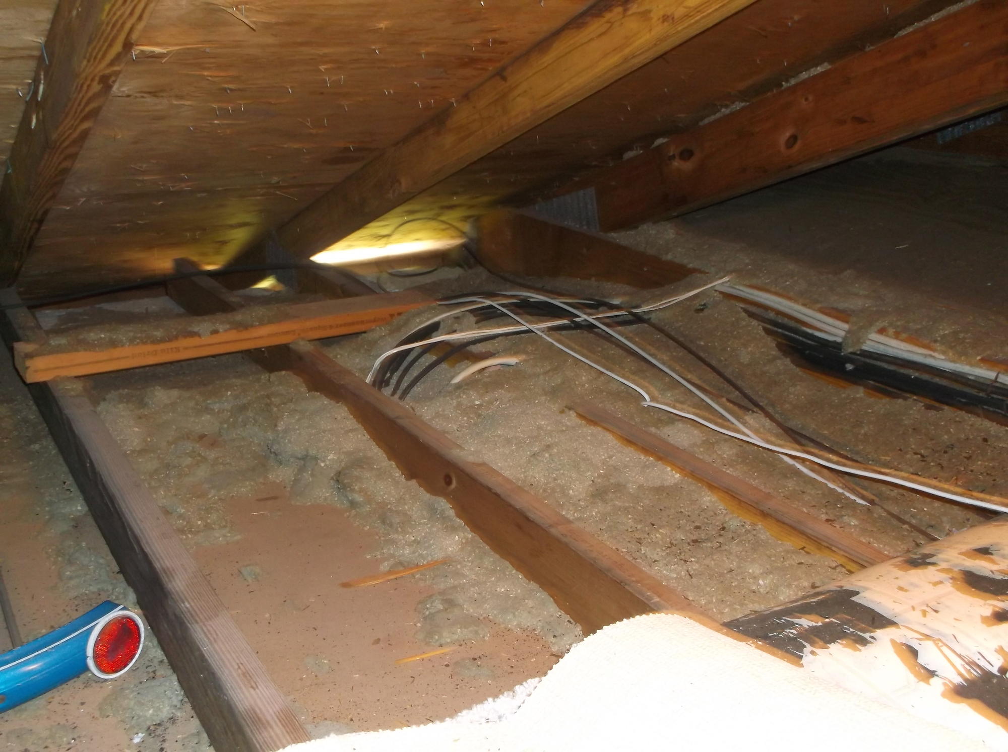 In the attached photo, the attic space was definitely “confined”. There was lighting present, but was inadequate to illuminate the entire space. Additionally, there was no sort of walkway to be able to reach other areas of the attic. The presence of protruding nails would have made it dangerous to try to crouch and step on the rafters to explore other areas of the attic.