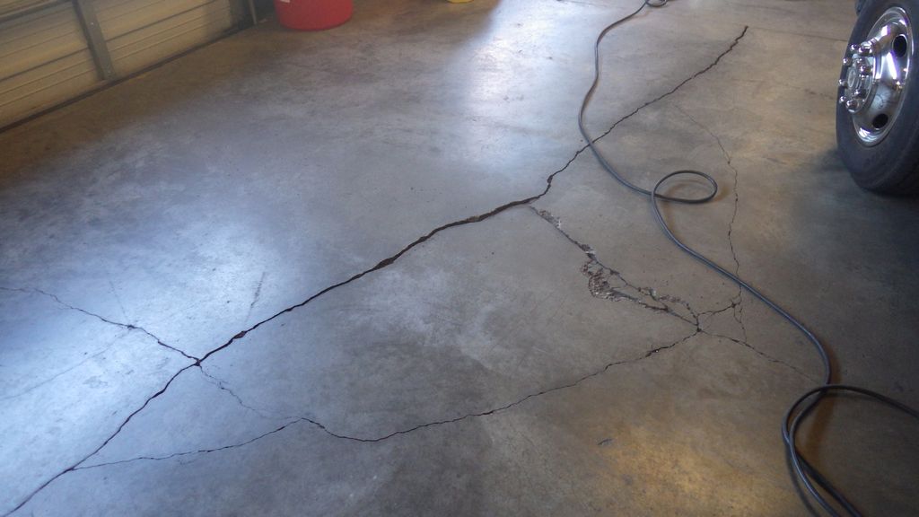 The cracking seen in the picture below exists in the bay floor of the fire station where I work. The floor is poured with approximately eighteen to twenty four inch slope from the back of the bay to the front. There are four bays and each bay is poured with a two to three inch rise between the bays, forming a trough that helps water run out of the bay. The cracks in the floor run all the way across the entire length of the bay. The cracks are the result of a combination of settling of the soil under the pads, water running down through the cracks every time the bay floor gets wet and the compression of the extremely heavy fire trucks that come and go. The cracking in the picture is the result of an eighty three thousand pound fire truck. A structural engineer will need to be consulted when repairing or replacing the floor.